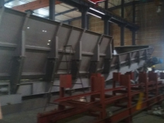 1)挡板,由挡板支撑装置斜撑固定在机体水平部分和倾斜部分的转折之处。挡板作用是将散料料堆阻挡在地表给料机的水平部分,防止散料向地表给料机的倾斜部分扩散,提高堆料效率。